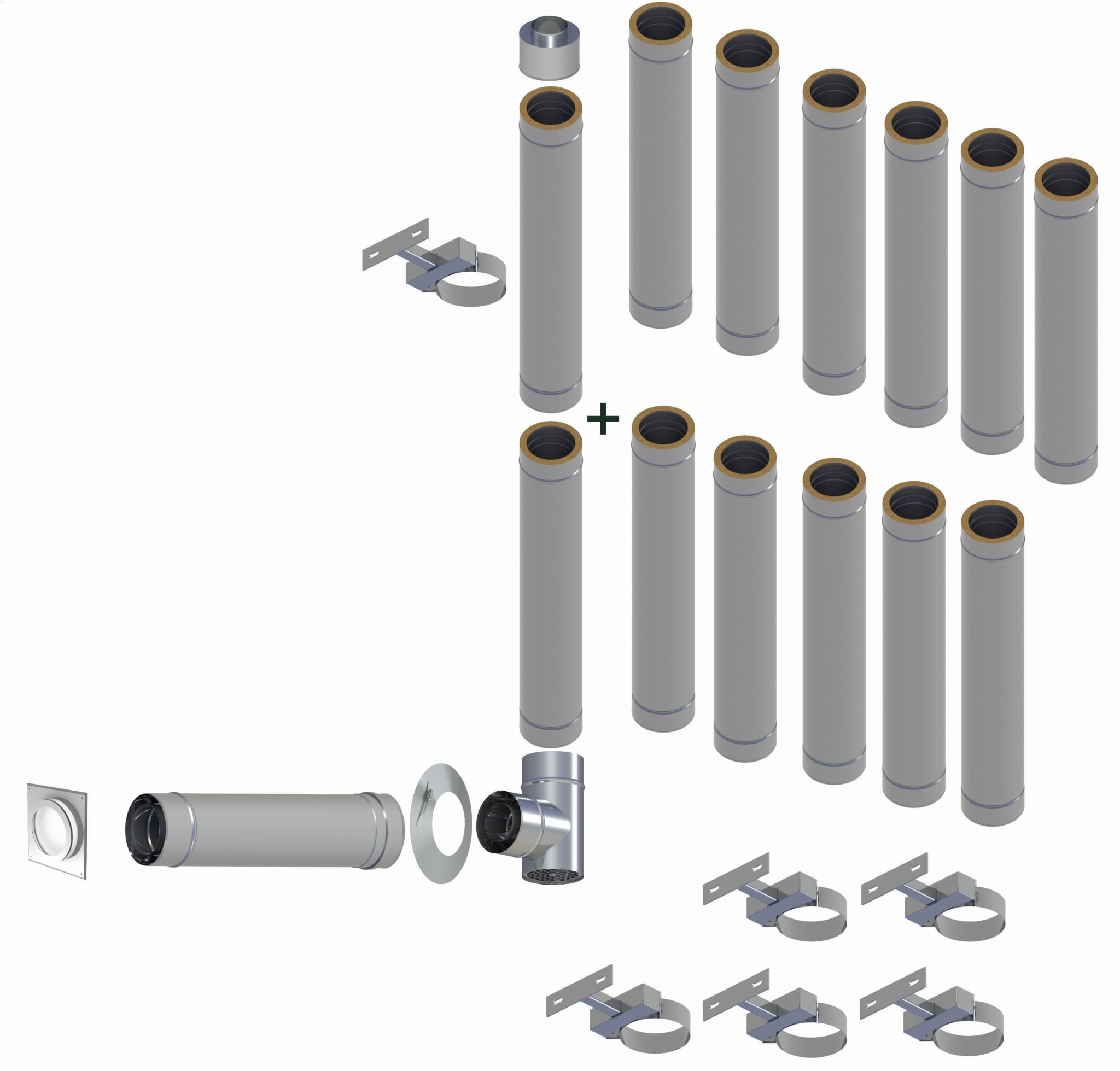 Do 200 Pa, szczelny, dwuścienny komin ze stali nierdzewnej wykonany z wysokiej jakości stali nierdzewnej do instalacji jako komin na zewnątrz. Niezbędną izolację cieplną zapewnia izolacja mineralna o grubości 22,5 mm między rurami wewnętrzną i zewnętrzną. W zależności od odpowiedniego materiału uszczelniającego, nadaje się do podłączenia do nowoczesnych pieców kondensacyjnych olejowo-gazowych o temperaturze spalin do 120 °C . Uszczelka EPDM